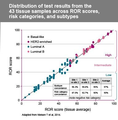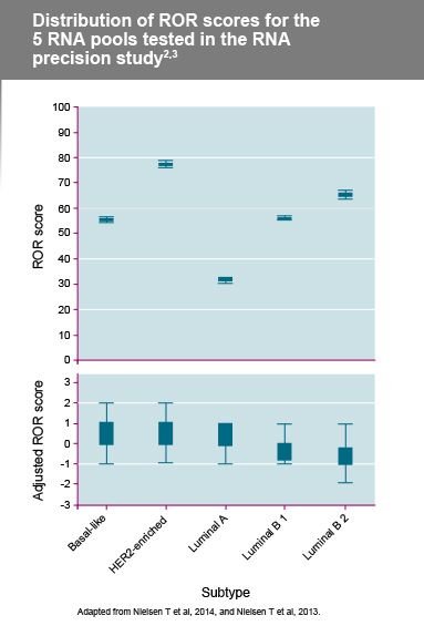 References: 1. Prosigna [Package Insert]. Seattle, WA: NanoString Technologies, Inc; 2013. 2. Nielsen T, Wallden B, Schaper C, et al. Analytical validation of the PAM50-based Prosigna Breast Cancer Prognostic Gene Signature Assay and nCounter Analysis System using formalin-fixed paraffin-embedded breast tumor specimens [published online ahead of print March 13, 2014]. BMC Cancer. doi:10.1186/1471-2407-14-177. 3. Nielsen T, McDonald S, Kulkarni S, et al. Analytical reproducibility of the breast cancer intrinsic subtyping test and nCounter® Analysis System using formalin-fixed paraffin-embedded (FFPE) breast tumor specimens. Poster presented at: 102nd United States and Canadian Academy of Pathology Annual Meeting; March 2-8, 2013; Baltimore, MD. Abstract 2075.