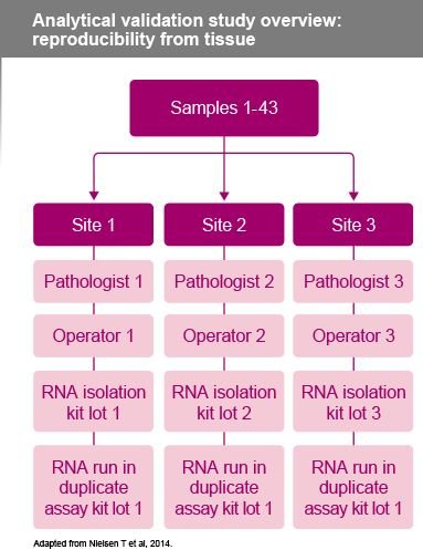 - Tekrarlanabilirlik, bağımsız H&E incelemesi, makrodiseksiyon ve her bir sahadaki laboratuvar personeli tarafından RNA izolasyonu dahil olmak üzere 3 sahada 43 FFPE bloğundan oluşan bir panel test edilerek değerlendirildi.
